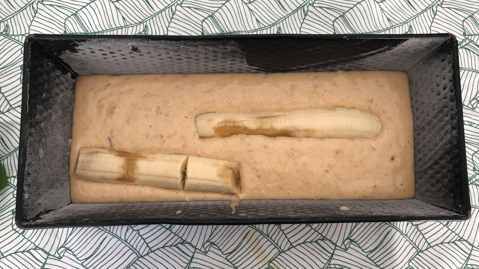 Gib den Teig in die Kastenform. Halbiere die letzte Banane von oben nach unten und leg sie auf den Teig.