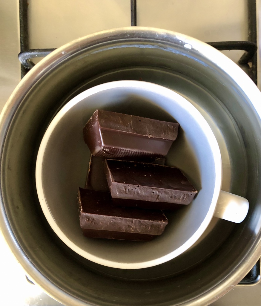 In der Zwischenzeit kannst du im Wasserbad die Schokolade erwärmen, die sollte zum Bestreichen der Igel am besten ganz flüssig sein. Hierfür gibst du die Schokostücke in eine kleine Schale, die wiederum in einen Topf, der mit Wasser gefüllt ist, passt. Wenn das Wasser auf dem Herd warm wird, schmilzt die Schokolade in der Schale.