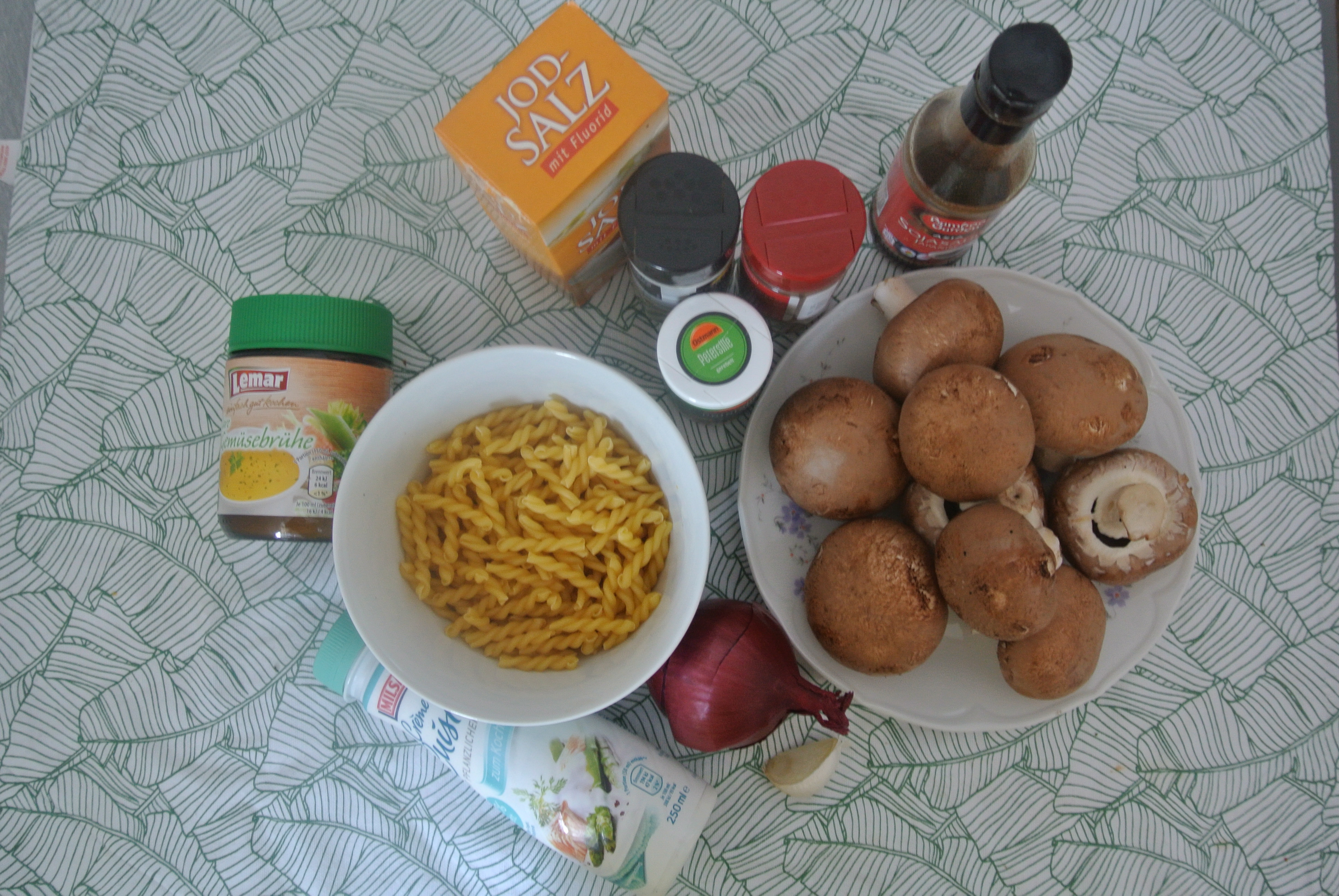 100 g Nudeln, 250 g Champignons, 200 ml Rama Creme Fine, 1 Zwiebel, 150 ml Gemüsebrühe, 1 EL Sojasoße, 1 Knoblauch, Petersilie, Salz, Pfeffer und Paprika