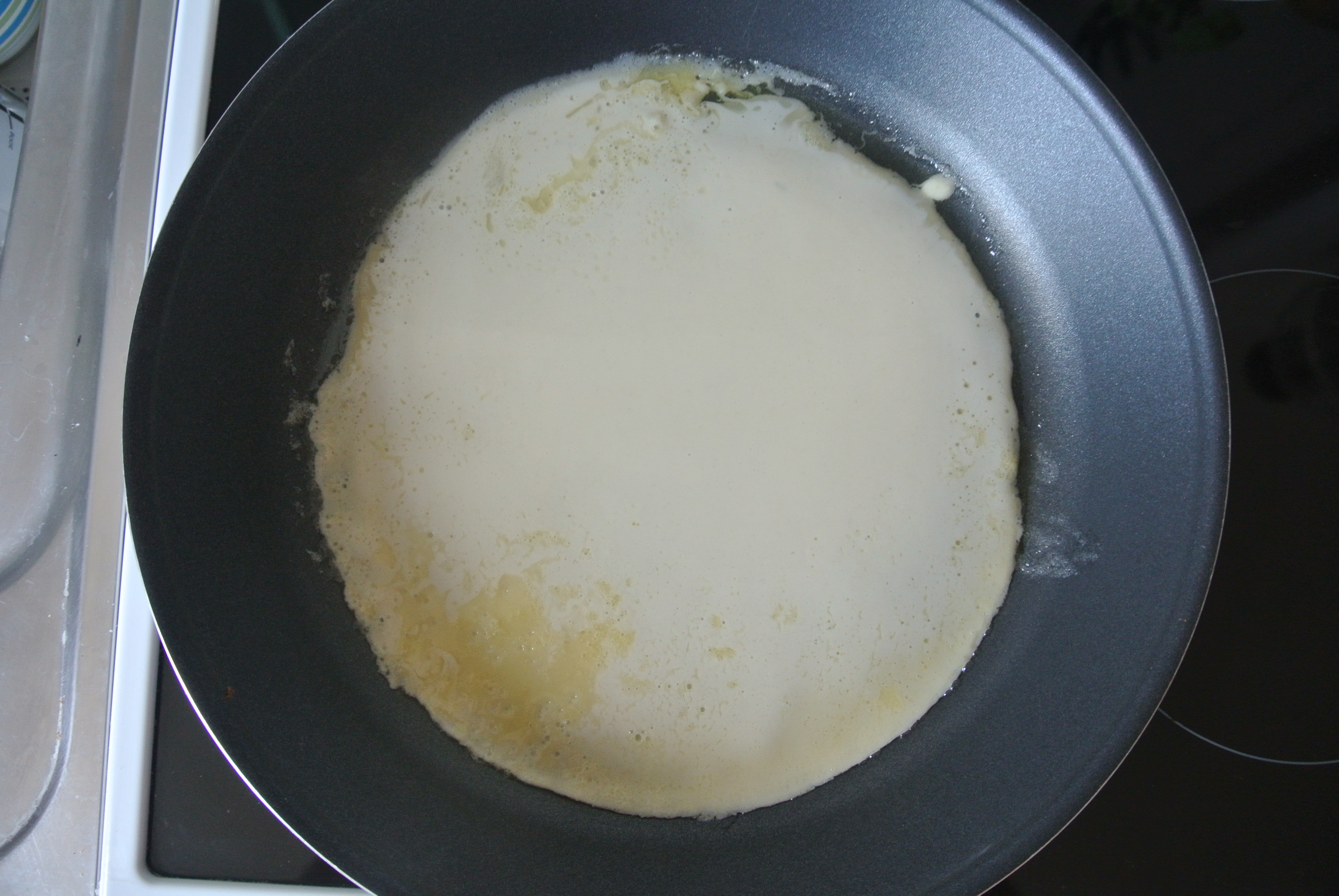 Gib eine Kelle von dem Pfannkuchenteig in die Pfanne und schwenke diese so, dass der Teig gut verteilt ist.